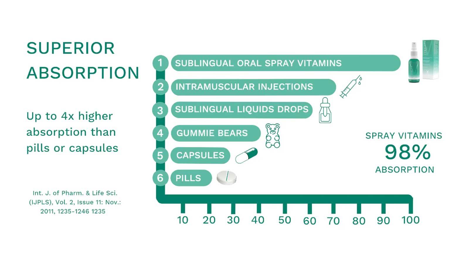 Peace of mind knowing that you're meeting your micro nutrient goals and not wasting your time or money. Liquid vitamins have the highest percentage of vitamin absorption. Liquid vitamins have the highest percentage of vitamin absorption.
